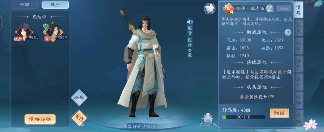 侠客与宠物是角色重要的战力外延和辅助。侠客方面,优先培养高资质的红色侠客,如东方不败、令狐冲,他们能提供强大的羁绊属性加成。侠客助战可以将侠客的部分属性按比例转化给角色,因此需将评分高的侠客放置在转化率高的阵位上。通过日常任务、江湖话本获取同心结等道具来提升侠客好感度,也是不可忽视的养成环节。宠物系统同样影响深远,一只紫品以上的强力宠物能通过属性转换提供可观助力。对宠物进行升级、培养,并为其洗髓以提升资质、学习合适的技能与功法心诀,都能有效增强实战能力,在不同战斗场景中搭配攻击型或防御型宠物以应对各种挑战。